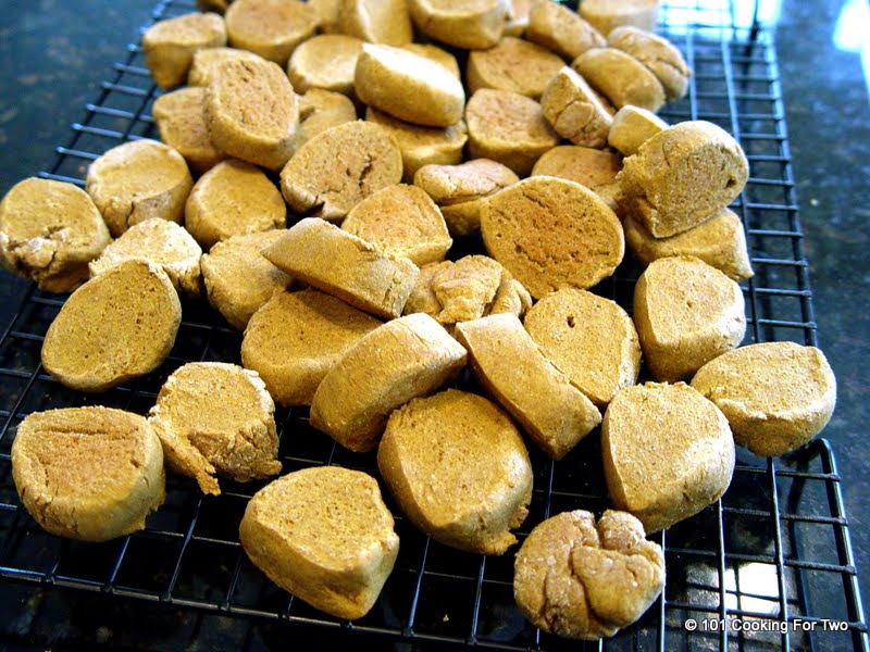 1) Preheat oven to 350 convection.2) Add 1/2 of a 14 oz can of pumpkin to 4 egg white, 1/4 cup water, 3 T peanut butter, 1/2 t salt and 1/2 t cinnamon. Turn on the mixer and combine until well mixed. 3) Now slowly add 3 cups of whole wheat flour with the mixer on 2. You will need to add a little more water to get all the flour incorporated. For me it was another 1/4 cup. This is a very dry dough.4) Place the dough on a cutting surface, cut into 4 equal pieces. Roll into logs of 1 inch diameter. Cut into 1/2 inch pieces. I got 61 bones.5) Prep 2 large cookie sheets with parchment paper and distribute the biscuits evenly. Bake for 30 minutes for semi hard.